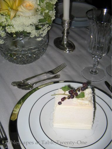 Each place setting began with a black charger in a contemporary cut topped with a simple square cut B. Smith plate. Black “San Remo” flatware is paired with a cut crystal-handled luncheon knife. “Longchamps” stemware completes the setting.