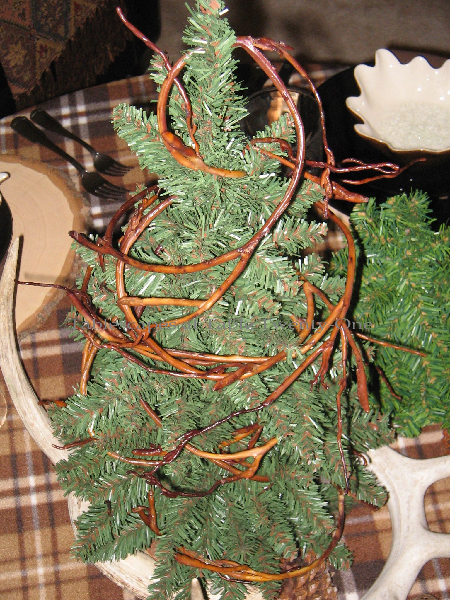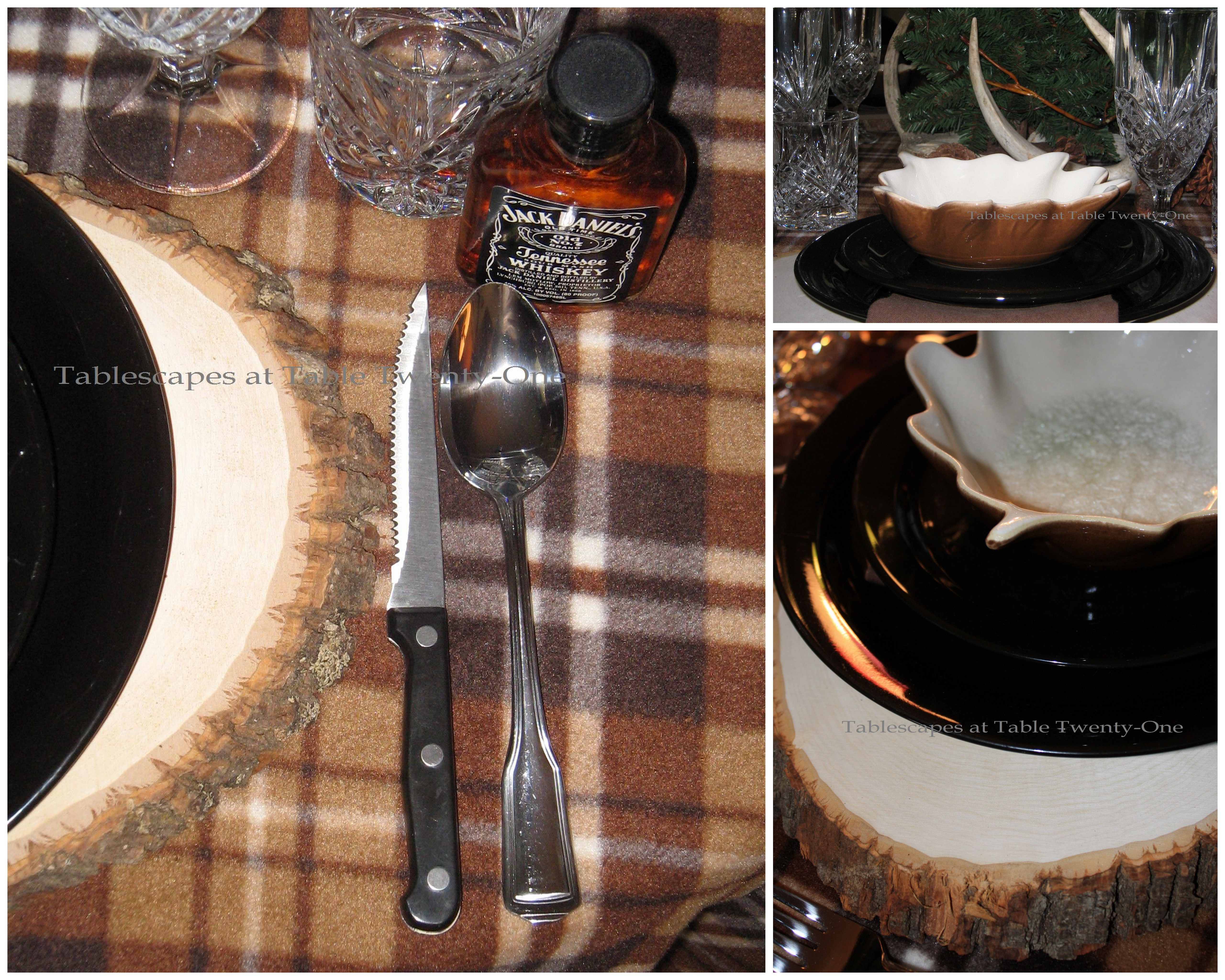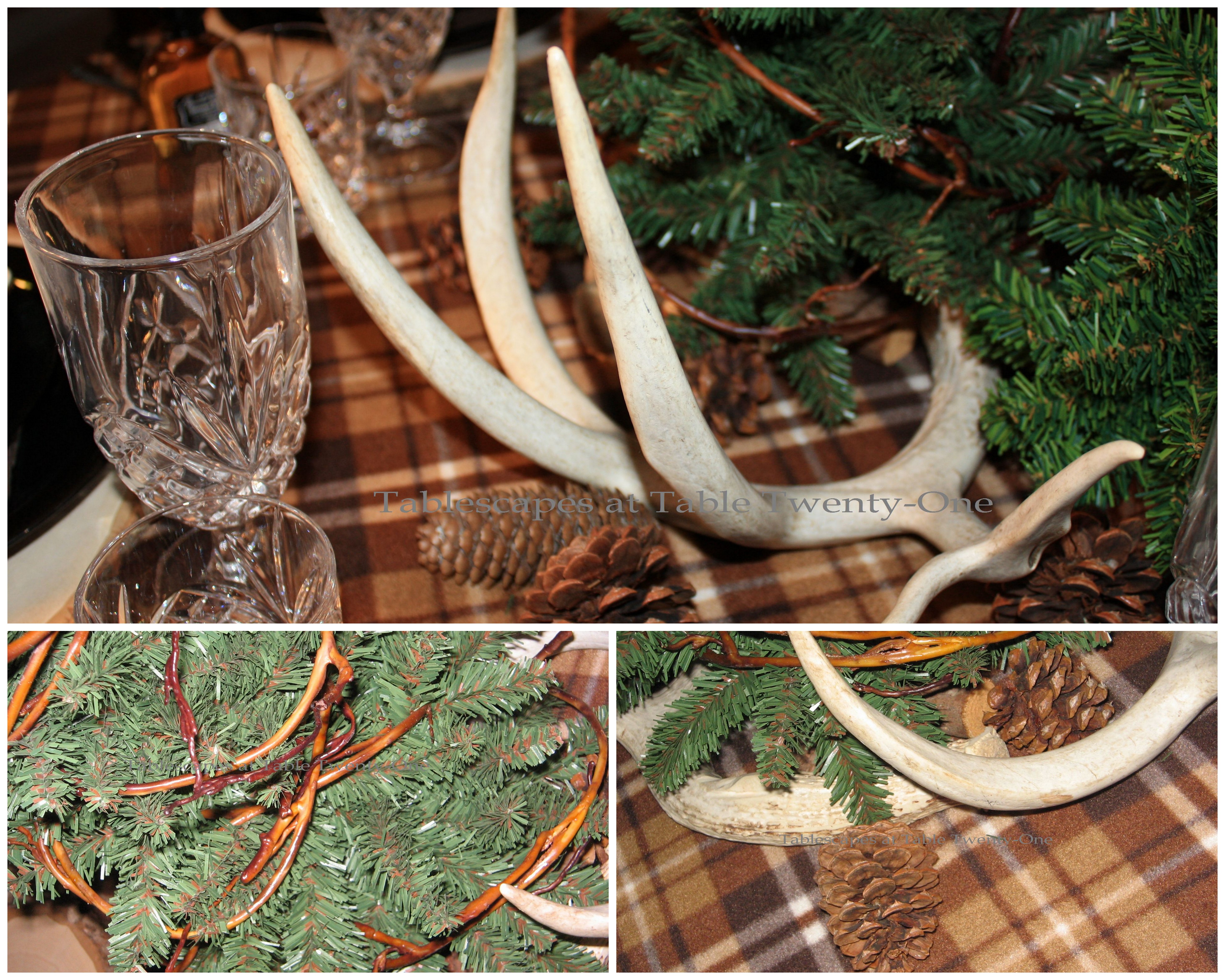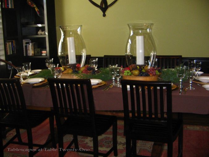 Simple clear glass stemware from Old Time Pottery doesn’t compete with the flurry of decor on the table. The “chargers” are rustic grapevine wreaths. (These were also used as chargers for an American Royal tablescape HERE.) Dark faux bamboo flatware from Home Goods works in concert with the chargers and branch design on the plates.