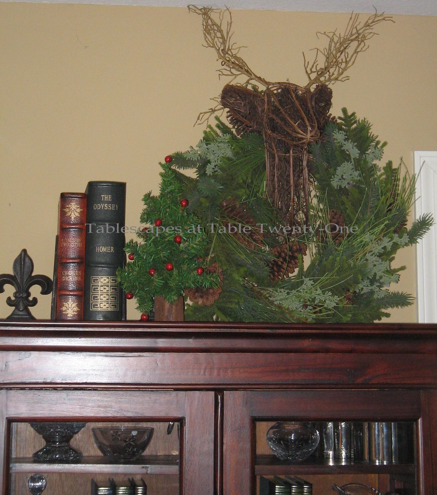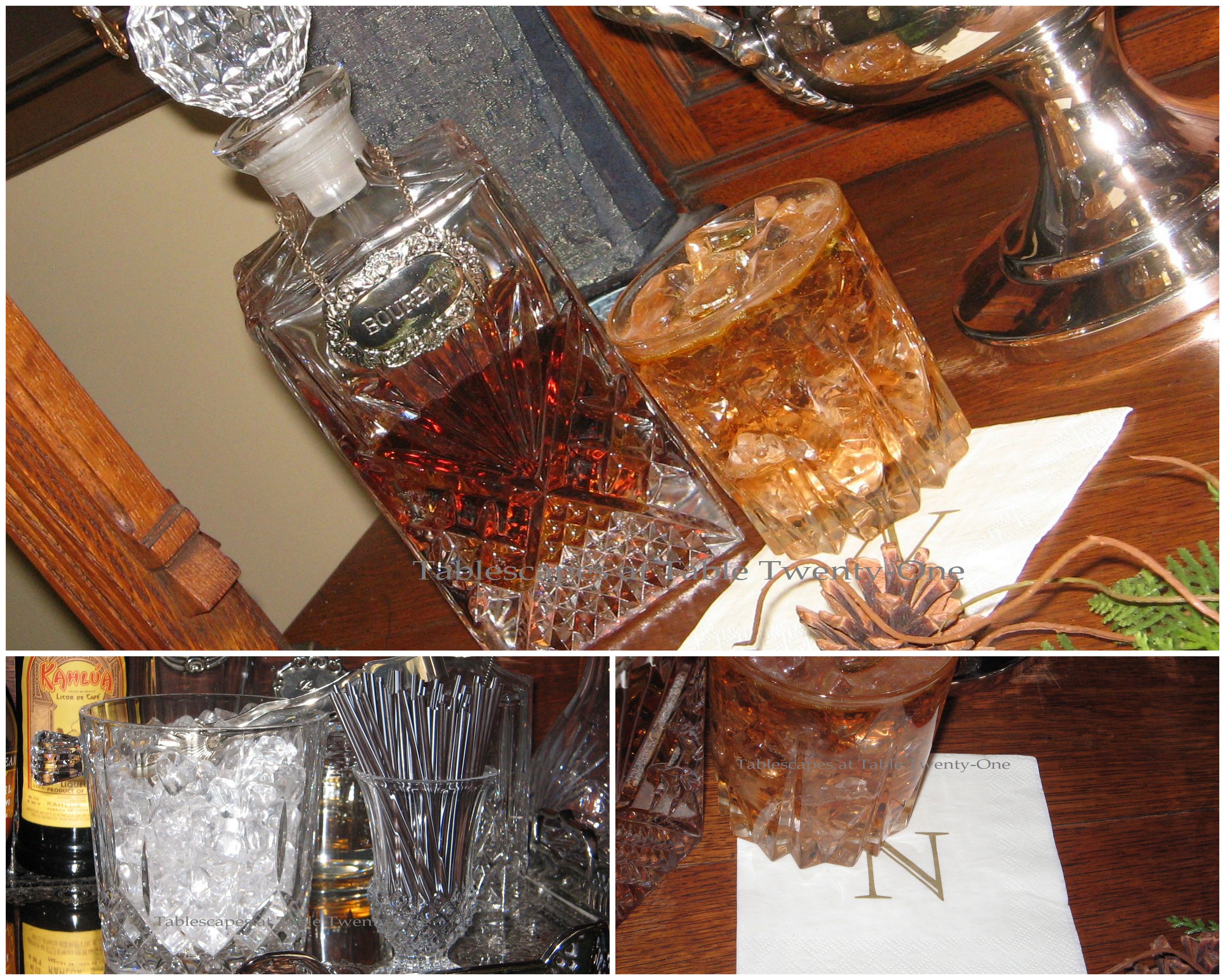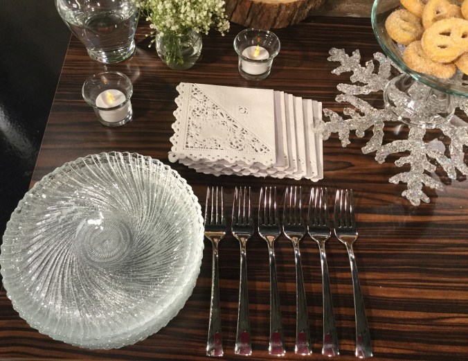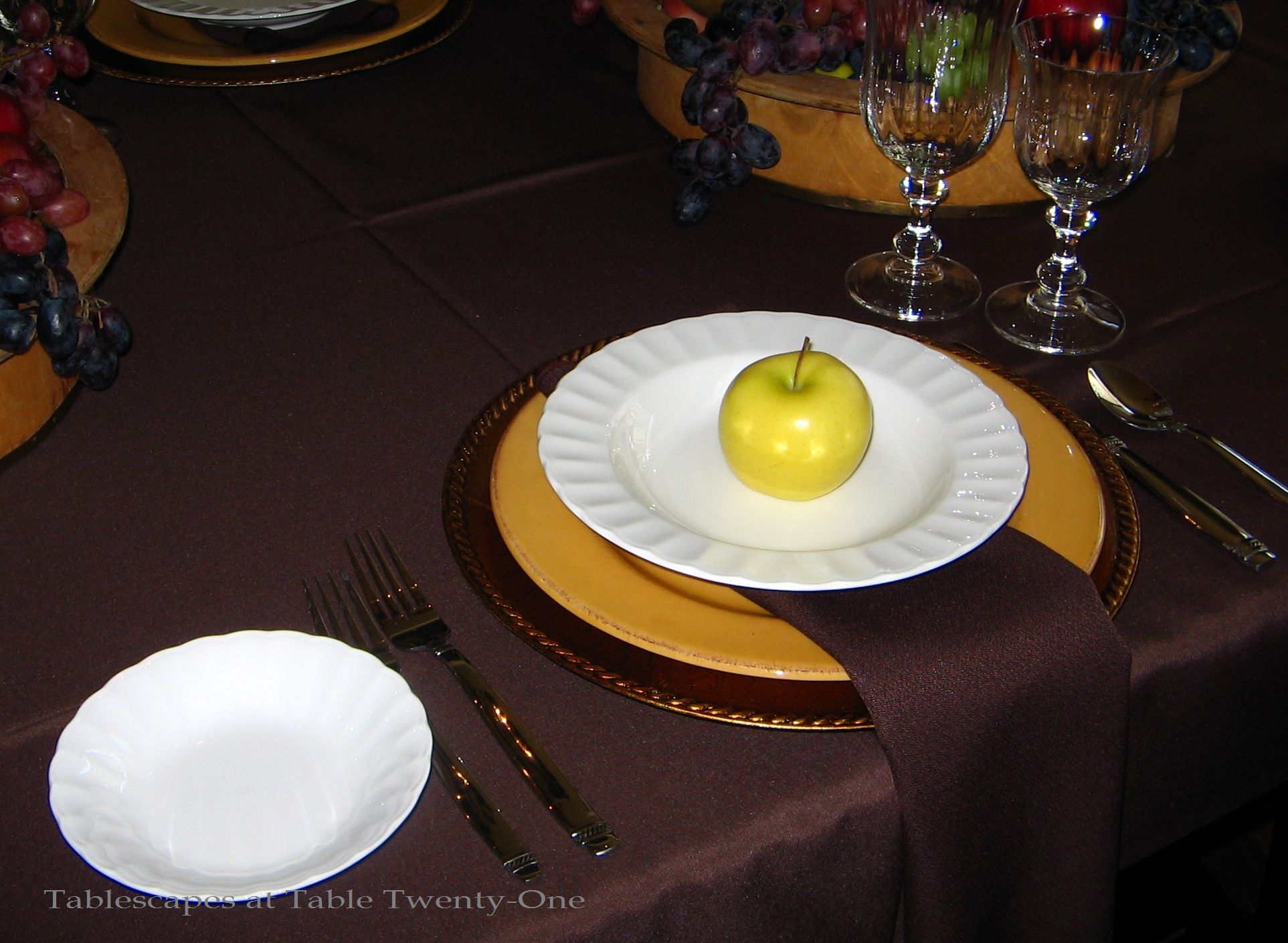 Simple clear glass stemware from Old Time Pottery doesn’t compete with the flurry of decor on the table. The “chargers” are rustic grapevine wreaths. (These were also used as chargers for an American Royal tablescape HERE.) Dark faux bamboo flatware from Home Goods works in concert with the chargers and branch design on the plates.