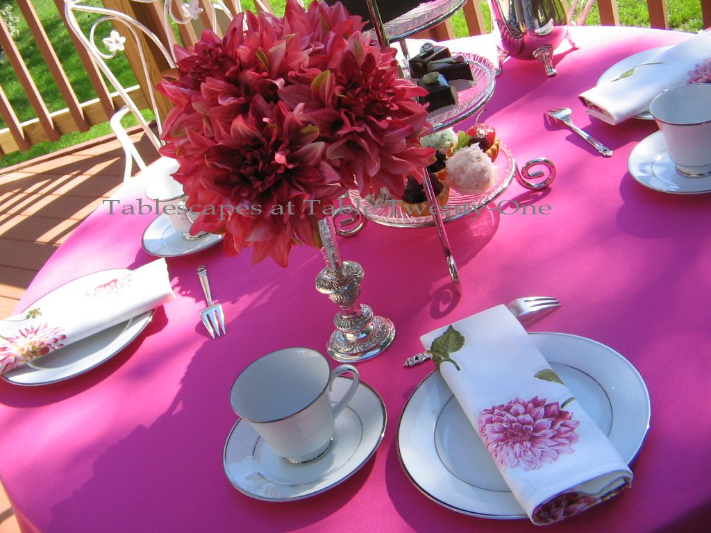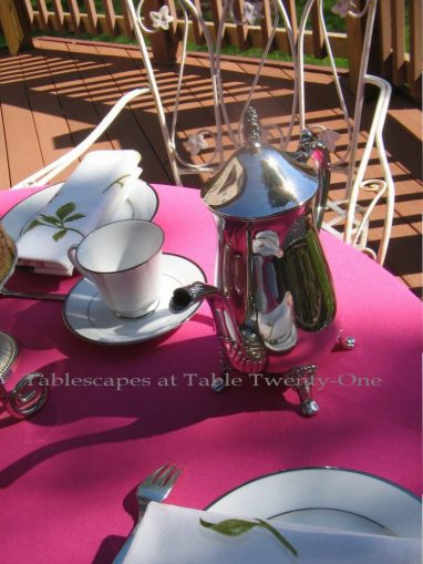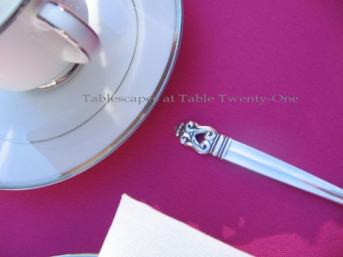 Imagination is key when setting a fun fantasy tablescape for any occasion. (This one would work well for a birthday, wedding shower, bridesmaids luncheon or girls night out dinner.) For this über-feminine, straight-from-the-dressing room tablescape, an ivory LinenTablecloth.com “clutch bag” napkin fold is set atop each plate with an oversized “diamond” clasp. The flatware is International Silver’s “Royal Danish” pattern. The stemware is Cristal d’Arques.