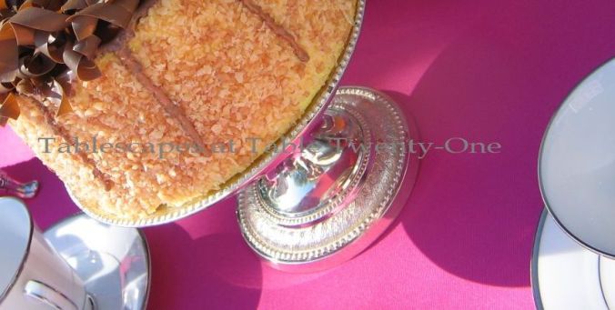 Rarely do I have a round cake with a large base (thanks to my step-daughter and nieces who are dragging their feet about getting married!), so my collection of silver cake plateaus is often called into service for other decorating. Here, I used a silver beaded-edge “hoop skirt” stand to add a little shine and raise more hat boxes in the center of the display.