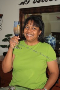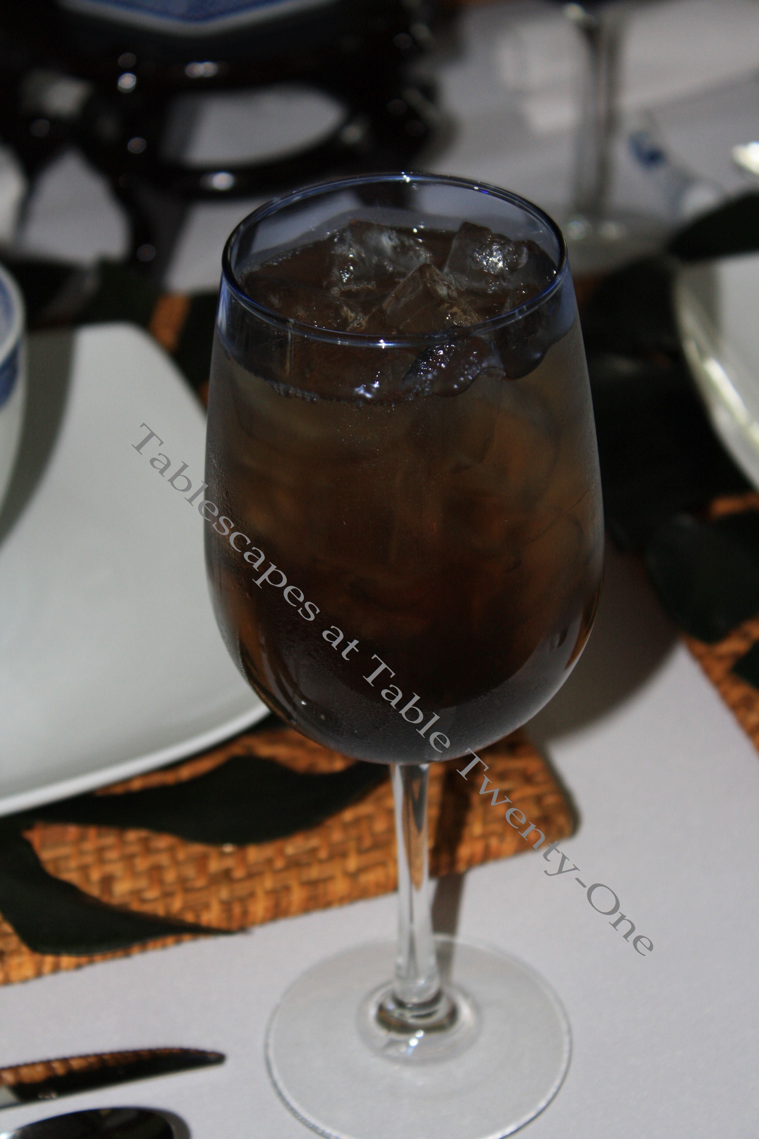 Cobalt blue goblets from Dollar Tree used for orange spice tea match the champagne flutes used for Mai Tais upon the guests’ arrival.