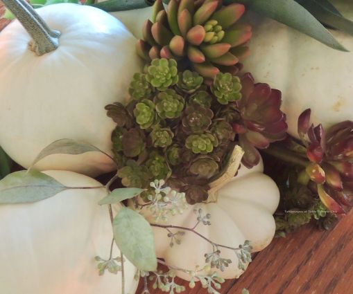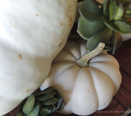 One way to bring the season to your table in climes where warm colors can overpower and autumn leaves simply don’t exist is to use white and pastel pumpkins along with lots of succulents.