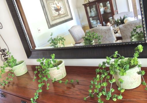 The dining table is loaded with decor, so I elected to keep the buffet behind it sparse. The clay pots I chose for these flowing succulents remind me of a weathered adobe home with its pinkish tones.