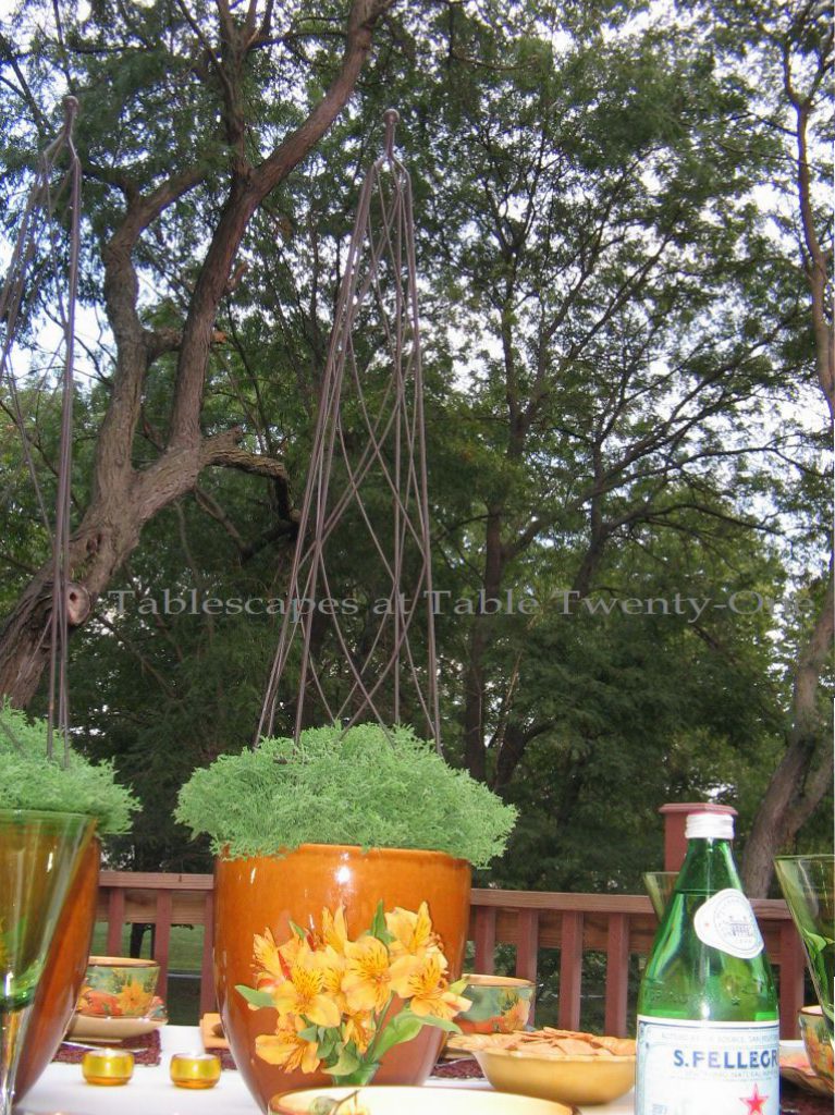A trio of paper parasols from Hobby Lobby extend the table colors across the deck.