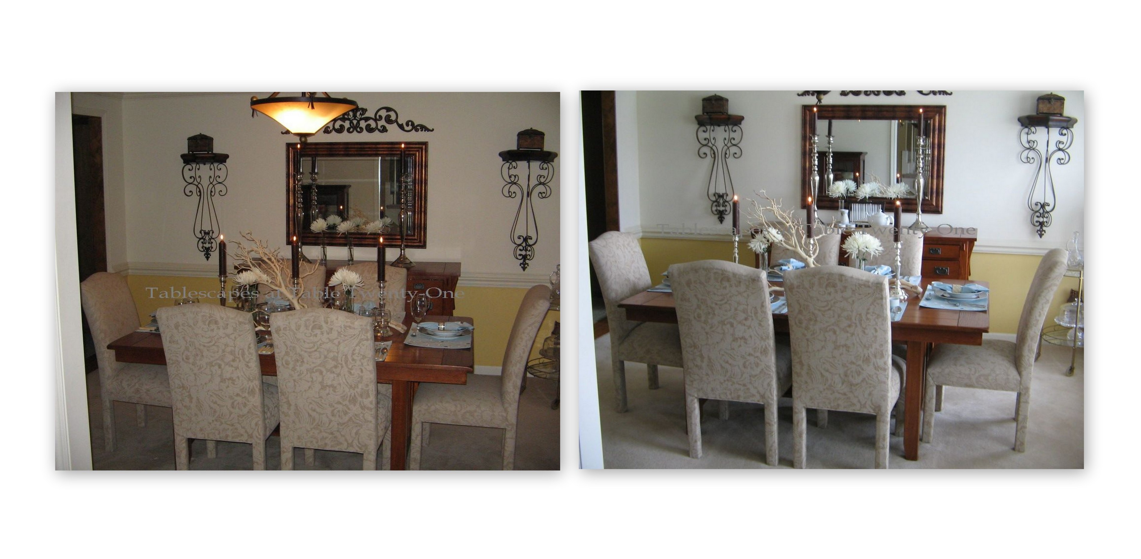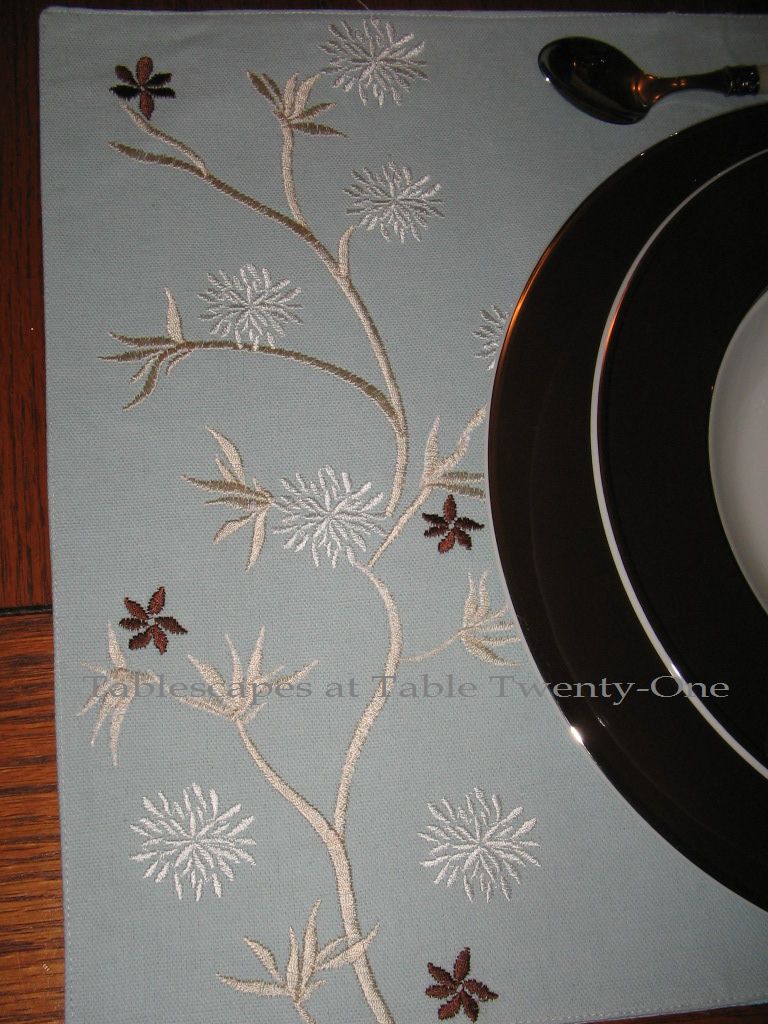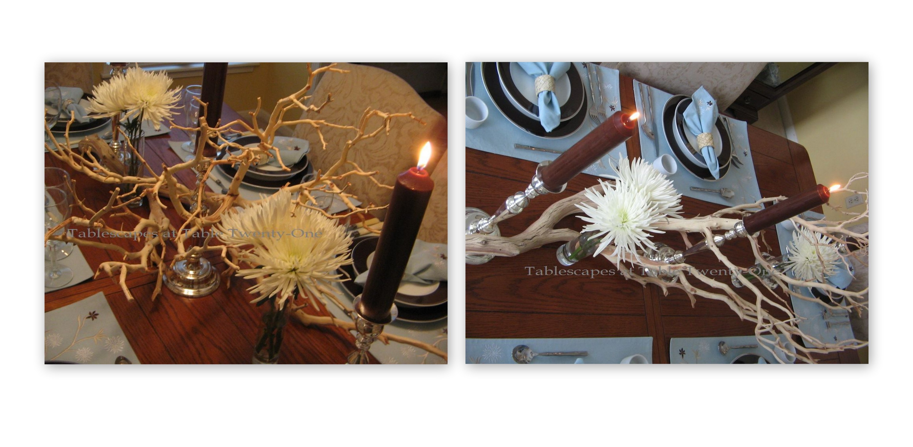 The elements of the unusual centerpiece remain the same for both tablescapes. A stripped natural manzanita branch from TJ Maxx (yeah, that’s right, TJ Maxx…who’d have thought?!??!) mimics both the color and curves of the branch on the placemat. Soothing white Fuji mums in clear glass Hobby Lobby cylinders stand alongside silver Revere candlesticks with chocolate brown candles. (Note: Fuji mums will last for a couple of weeks if you cut the stem on the diagonal, change the water every couple of days, and maintain a comfortable room temperature.)