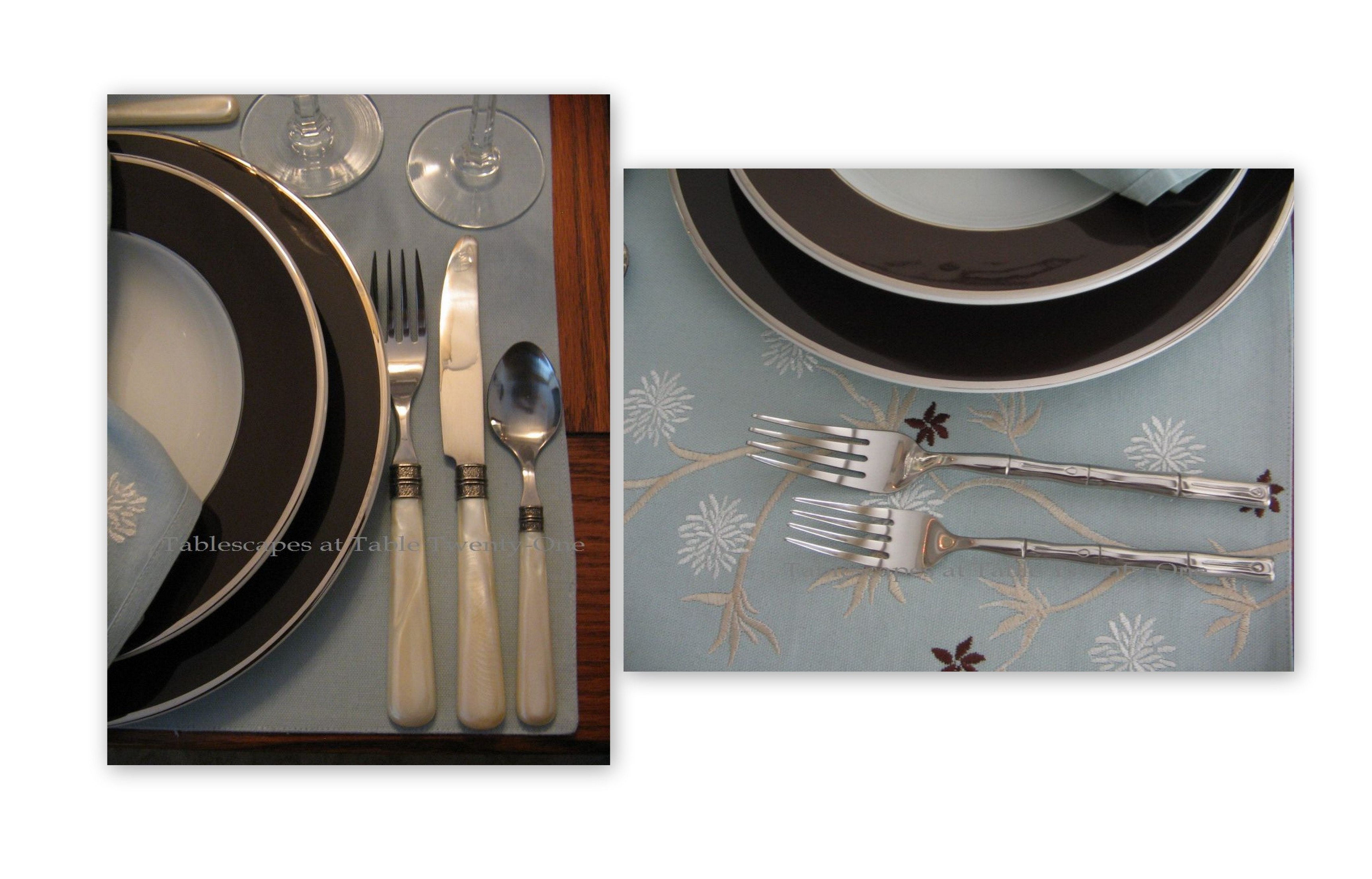 The flatware on the left with faux mother of pearl handles is distinctively different from the stainless bamboo on the right which evokes a more deliberate Asian feel. (Both from Target.)
