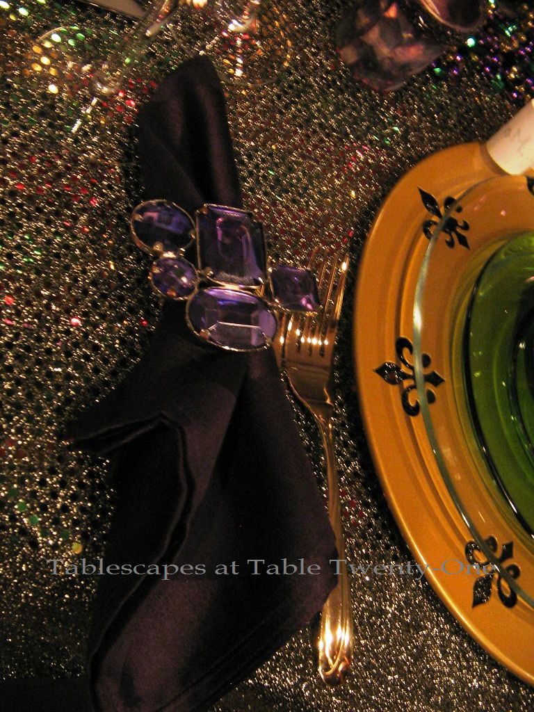 Purple gemstone napkin rings from Z Gallerie hug the sheer organza Pier 1 napkins. Here you are better able to see the cobbled texture of the chargers.